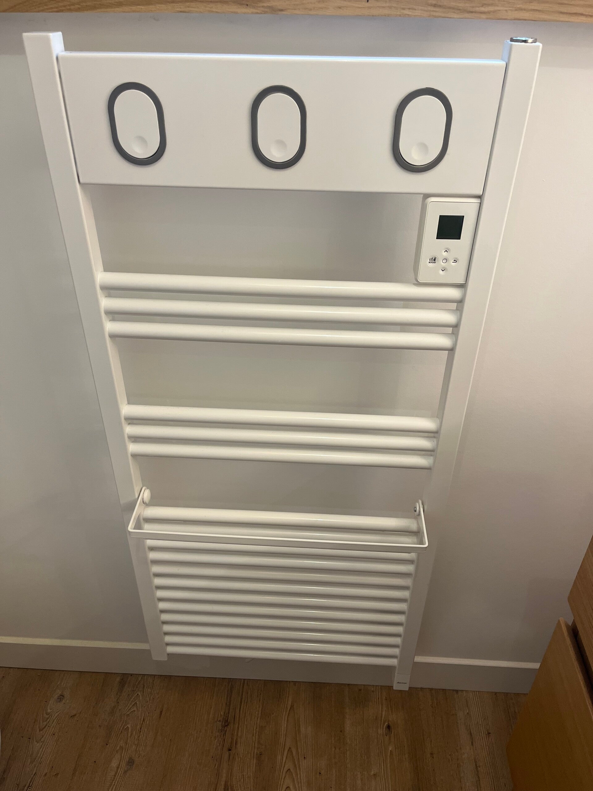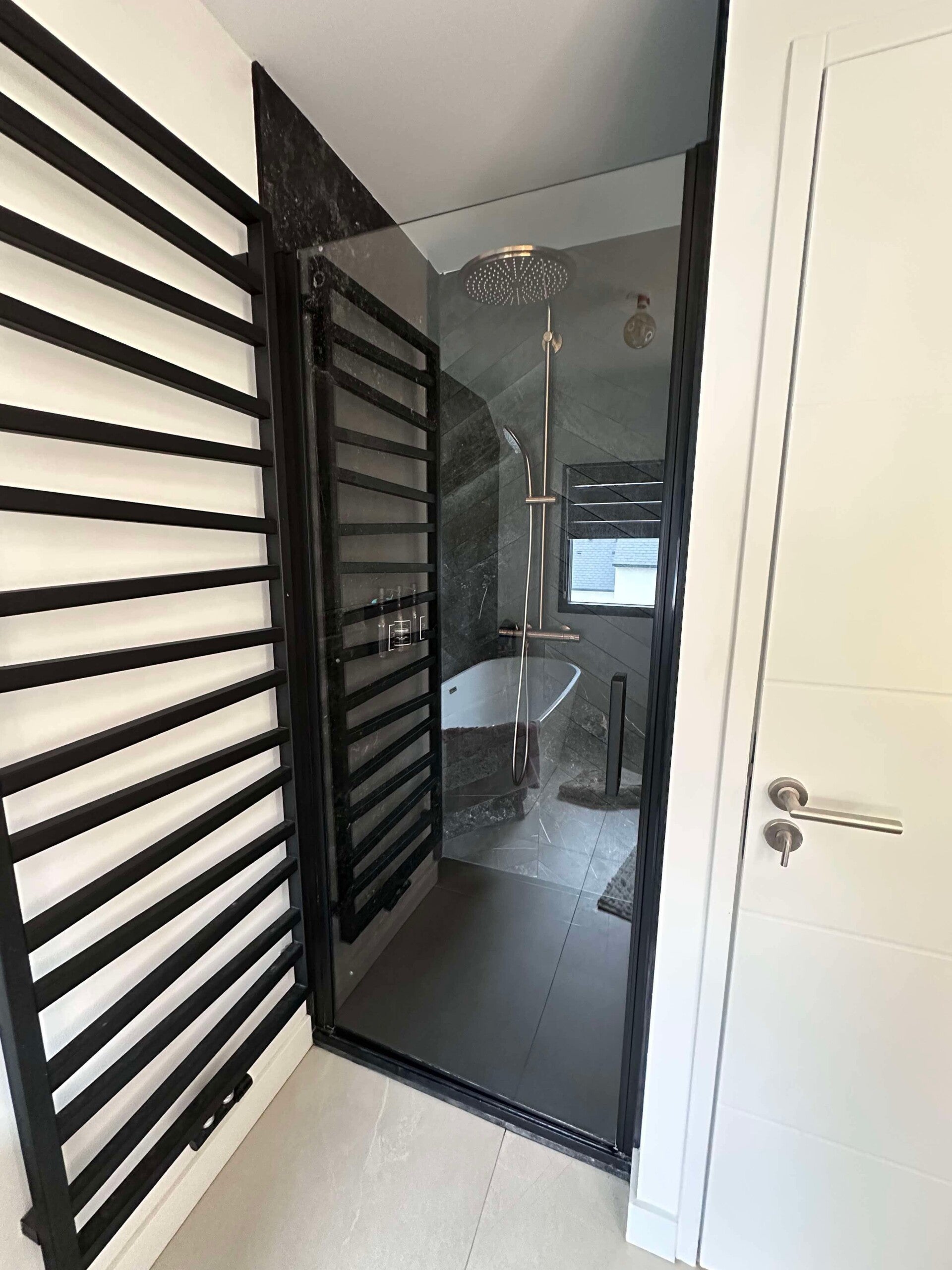 Installation d’une baignoire îlot avec robinetterie sur pied, d’un WC suspendu, d’une douche équipée de sa paroi vitrée et de sa robinetterie, ainsi que d’un sèche-serviette design.